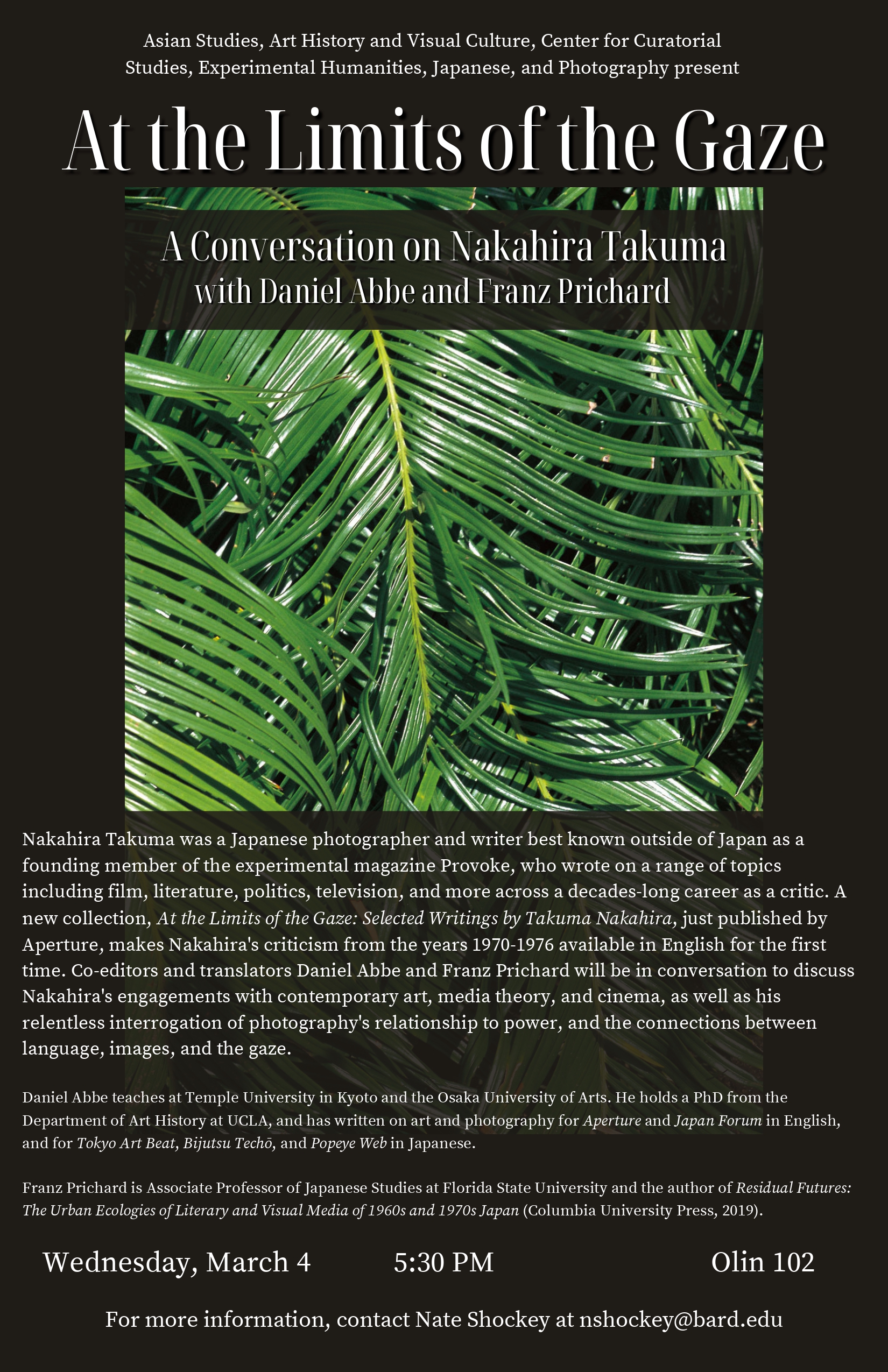 Nakahira Takuma was a Japanese photographer and writer best known outside of Japan as a founding member of the experimental magazine Provoke, who wrote on a range of topics including film, literature, politics, television, and more across a decades-long career as a critic. A new collection, At the Limits of the Gaze: Selected Writings by Takuma Nakahira, just published by Aperture, makes Nakahira’s criticism from the years 1970-1976 available in English for the first time. Co-editors and translators Daniel Abbe and Franz Prichard will be in conversation to discuss Nakahira’s engagements with contemporary art, media theory, and cinema, as well as his relentless interrogation of photography’s relationship to power, and the connections between language, images, and the gaze.
