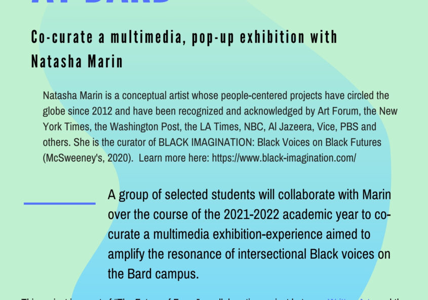 Black Imagination at Bard Co-curate a multimedia, pop-up exhibition with Natasha Marin Application deadline: October 20, 2021 Apply here: https://forms.gle/LH18Tm1GYjRk2wph9 Event Information Natasha Marin is a conceptual artist whose people-centered projects have… -