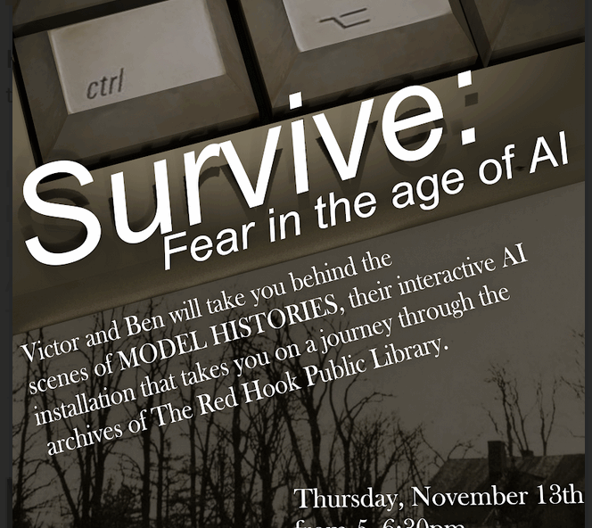 Ctrl+Alt+Survive: Fear in the age of AI November 13 @ Stevenson Library 5-6:30pm Join multimedia artists Victor Morales and Ben Williams in conversation with Alex Geller, Director of the Red Hook Public…