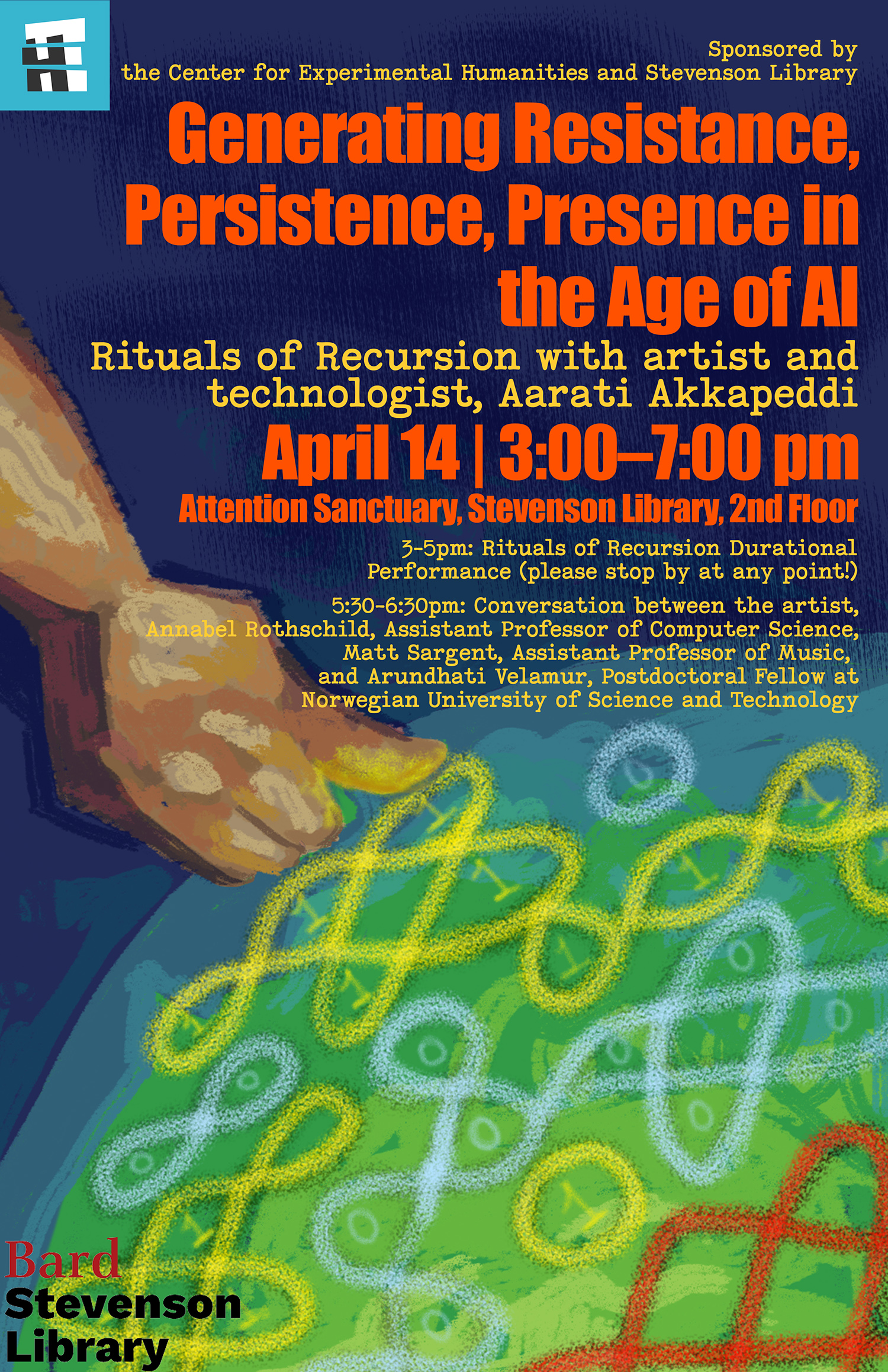5:30-6:30pm — Conversation between the artist, Annabel Rothschild, Assistant Professor of Computer Science, Matt Sargent, Assistant Professor of Music, and Arundhati Velamur, Postdoctoral Fellow at Norwegian University of Science and Technology