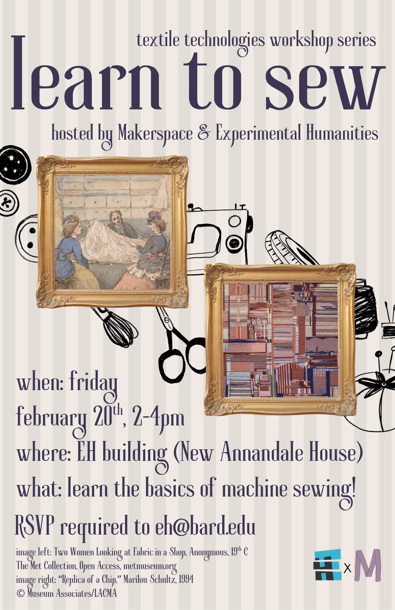 Learn to Sew is back for Spring 2026! This workshop is for those with limited-to-no sewing experience who would like to learn the basics of using a sewing machine and make a small project. A collaboration between the Center for Experimental Humanities and Makerspace, this workshop is part of a Textile Technologies series which focuses on autonomy, creativity, and hands-on skills as a way of reclaiming means of production. The number of participants for the Learn to Sew workshop is very limited so make sure to RSVP to secure your spot.